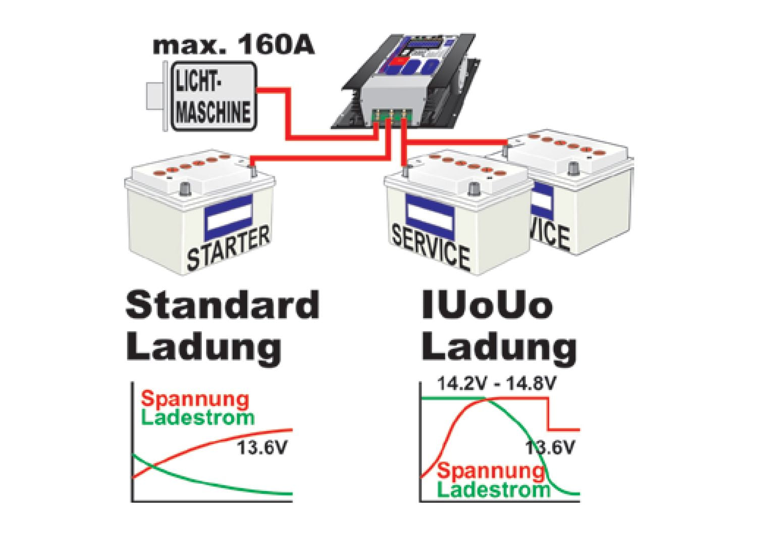 durch Messung der Ladespannung direkt an der Verbraucherbatterie gesteuert. Die Ladung wird zusätzlich durch Temperatursensoren an Batterie und Lichtmaschine überwacht.