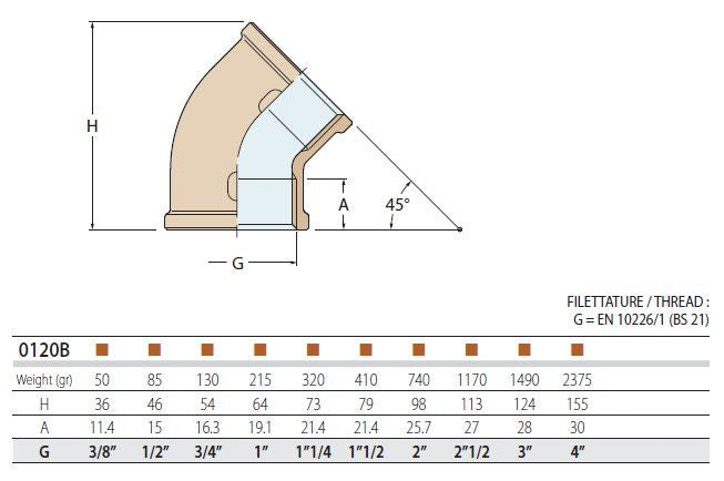 45° Rohrwinkel aus Rotguss (seewasserbeständige Bronzelegierung) mit zwei zölligen Innengewinden.