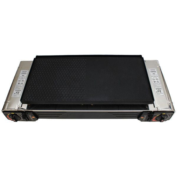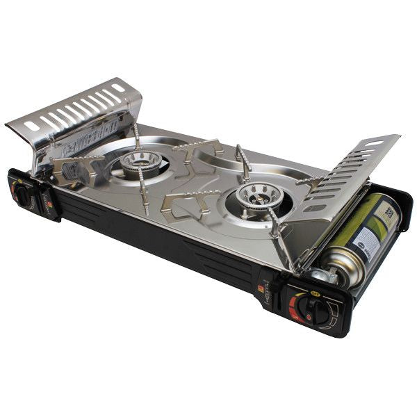 1852 Gaskocher mit zwei separaten Brennern, die von zwei separaten Butan-Gaskartuschen (nicht im Lieferumfang) betrieben werden. Die Brenner verfügen über einen großen Flammenverteiler mit Piezozünder und stufenloser Flammenregulierung, der die Hitze gut verteilt und für eine gleichmäßige Hitze sorgt.