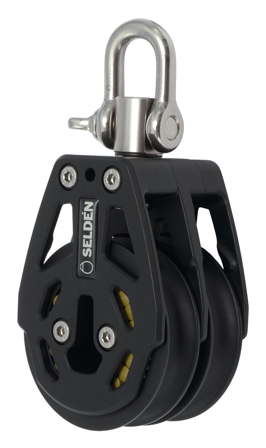 Roller bearing yacht blocks for high dynamic working loads . These blocks are characterized by smooth running and low weight . Jaws made of black anodized aluminum, bearing rollers made of Delrin® , and lateral ball bearings made of Torlon® ensure smooth running.