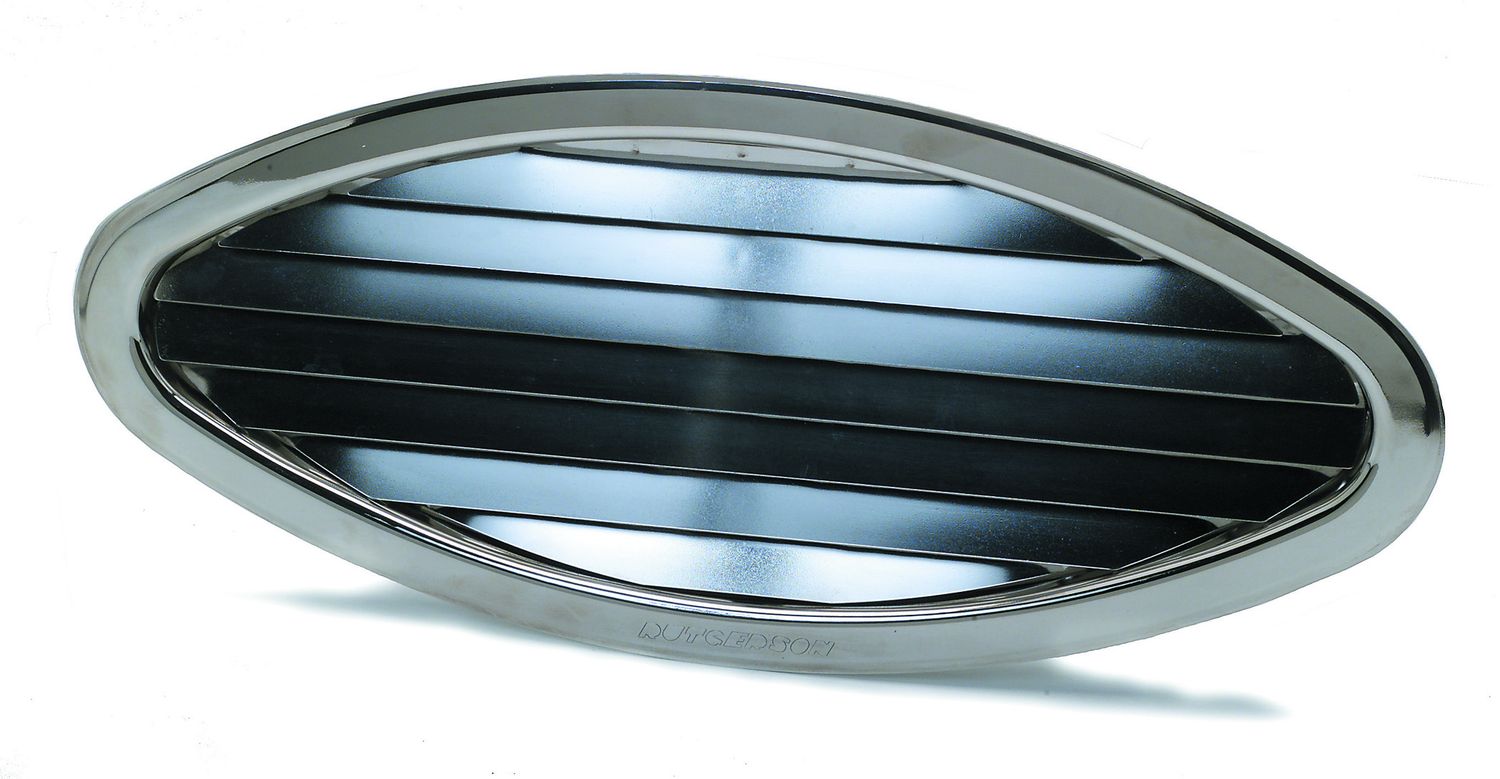 Elliptical engine compartment vent grille made from 1.5mm thick machine-polished and electropolished stainless steel. The frame is machined from a single piece – no seams or grooves where rust can form. The grille's design is a perfect visual match for Rutgerson Port Lights.