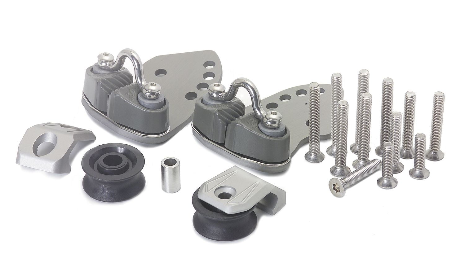 Kit including one curry clamp with angle-adjustable bracket and one single-disc block for making a two-part traveler tackle.