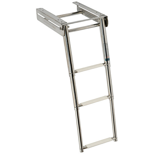 Three-step swim ladder made of stainless steel with oval steps and a non-slip white plastic coating. The telescopic ladder folds into a cassette equipped with a secure front locking mechanism.