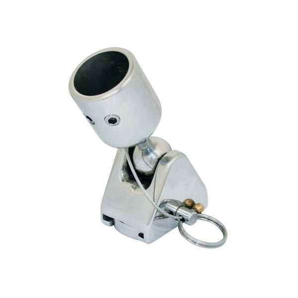 Abnehmbare Decksbeschlag-Halterung auf Minischiene montiert. Bewegung 30° zur Seite und 190° vorwärts/rückwärts. Gegossener Abdeckbügel aus hochglanzpoliertem Stahl AISI 316 für 22mm Rohr. Passt zu den bereits gängigen Haubenhalterungen auf dem Markt.