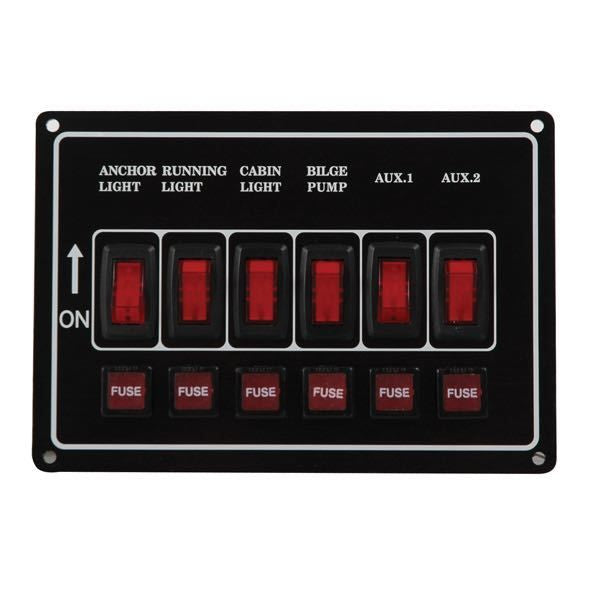 Schwarz lackierte Aluminiumschalttafel mit 6 Schaltern für 12V, beleuchteten Kippschaltern und 6 Sicherungen
