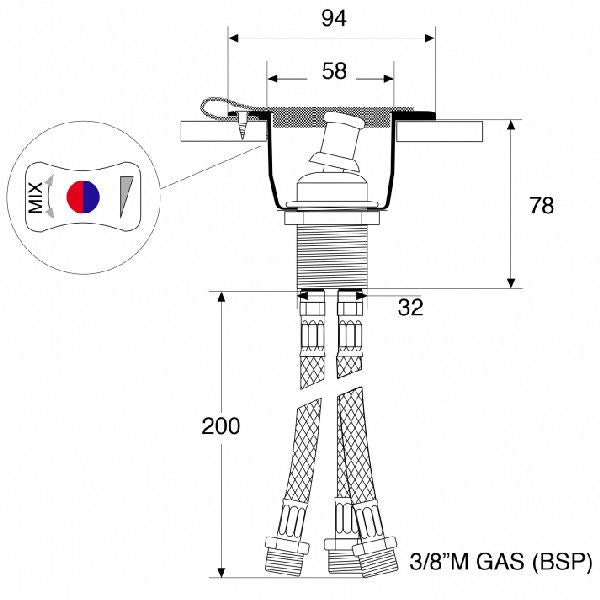 Verchromtes Messing, montiert in einem weißen Kunststoffgehäuse mit Deckel.