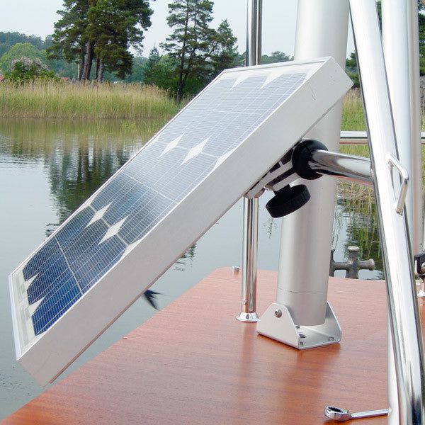 Das Solarmodul wird auf zwei Q-Profilen fixiert und lässt sich dann mit zwei kräfitigen Rohrschellen an einer Querstrebe des Heckkorbs befestigen. Eine Befestigung an vertikalen Streben ist ebenfalls möglich.