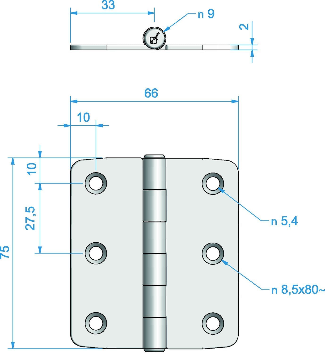 Scharnier aus Edelstahl AISI 316. Achsführung oben.