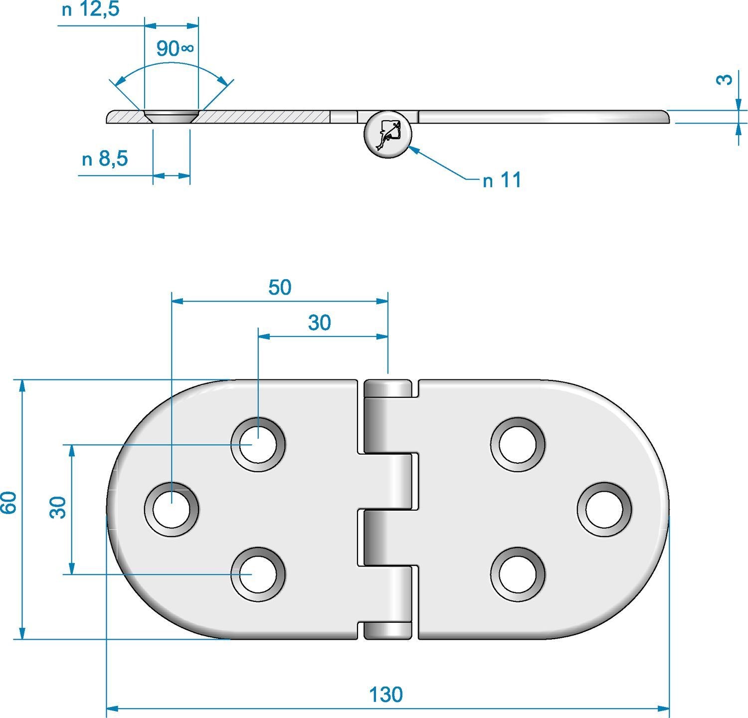 Scharnier aus Edelstahl AISI 316. Achsführung unten.