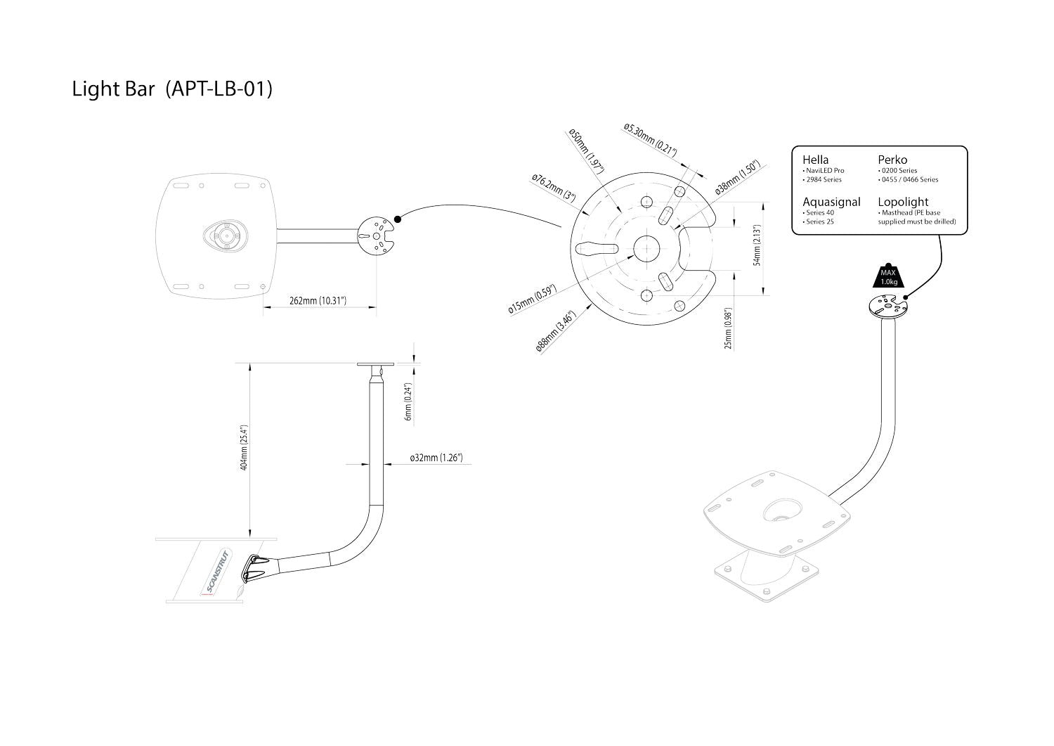 Lichtmast für die Scanstrut PowerTower, es passen viele LED-Navigationslichter auf die Grundplatte zum Beispiel von Hella (NaviLED 360 Pro, Serie 2984), Aquasignal (Serie 40 und 25), Perko (Serie 0200 und 0455/0466) oder Lopolight (mitgelieferter PE-Sockel muss gebohrt werden).