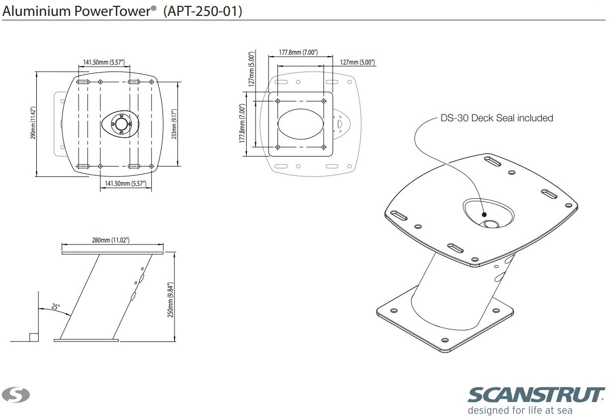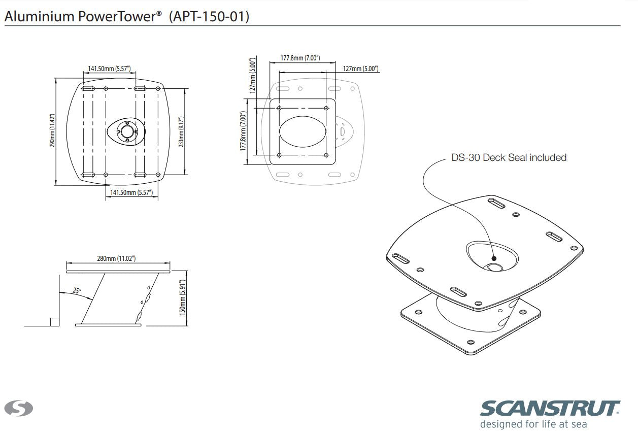 Nach hinten geneigter Scanstrut PowerTower Sockel zur Installation einer Radarantenne.