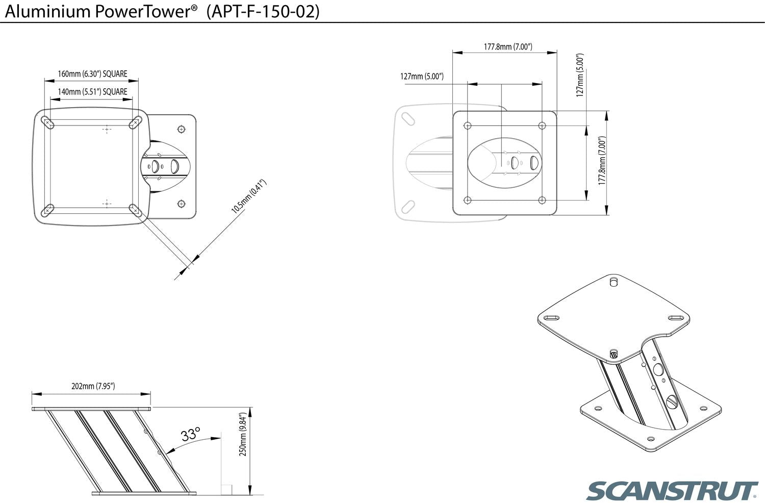 Nach vorne geneigter Scanstrut PowerTower Sockel zur Installation einer Radarantenne.