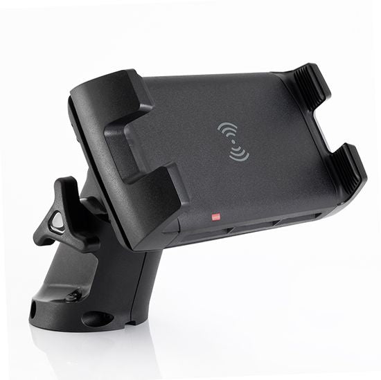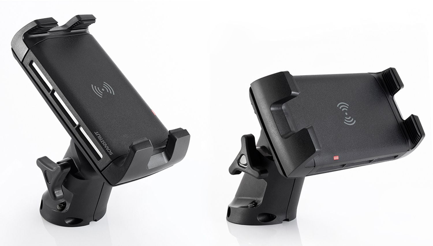 Dank der flexiblen Halterung kann das Smartphone waagerecht oder senkrecht ausgerichtet und bis zu 60° geneigt werden. Eine Rendelschraube sorgt für den nötigen halt in der optimalen Position. Die griffigen, selbstausrichtenden Backen beklemmen das Mobilphone auch bei rauhen Bedingungen zuverlässig in der Halterung.