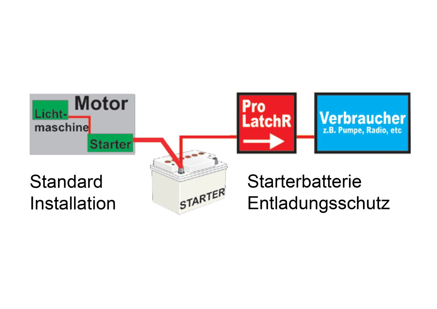 Das Pro Latch R kann als Starterbatterie-Schutzrelais eingesetzt werden. Dabei werden die Verbraucher, welche die Batterie entladen, an den Ausgang des Pro Latch R angeschlossen. Bei Unterschreiten eines vorprogrammierten Wertes (Standard 12,4V/24,8V), schaltet das Relais ab. Der Trend der Spannung ist auslösendes Moment der Trennung. Dadurch bleibt genug Energie in der Batterie, um den Motor zu starten.