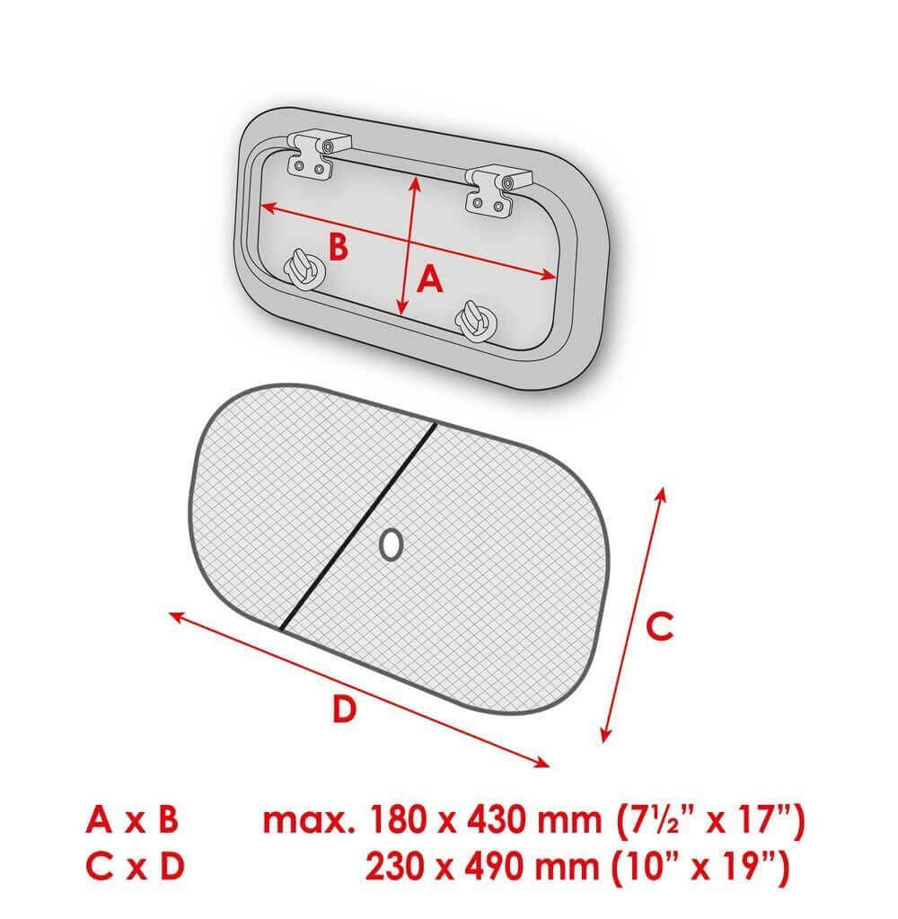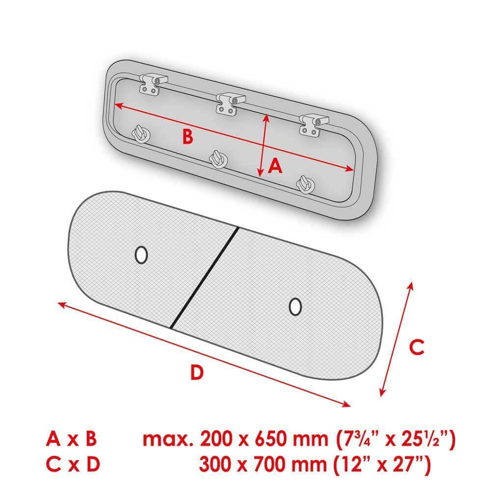 Die angebotenen Größen (siehe Auswahl) passen auf nahezu alle handelsüblichen Luken und Fenster im Handel. Alle Verdunkelungen werden mit allen erforderlichen Montagematerialien und einer Aufbewahrungstasche geliefert.
